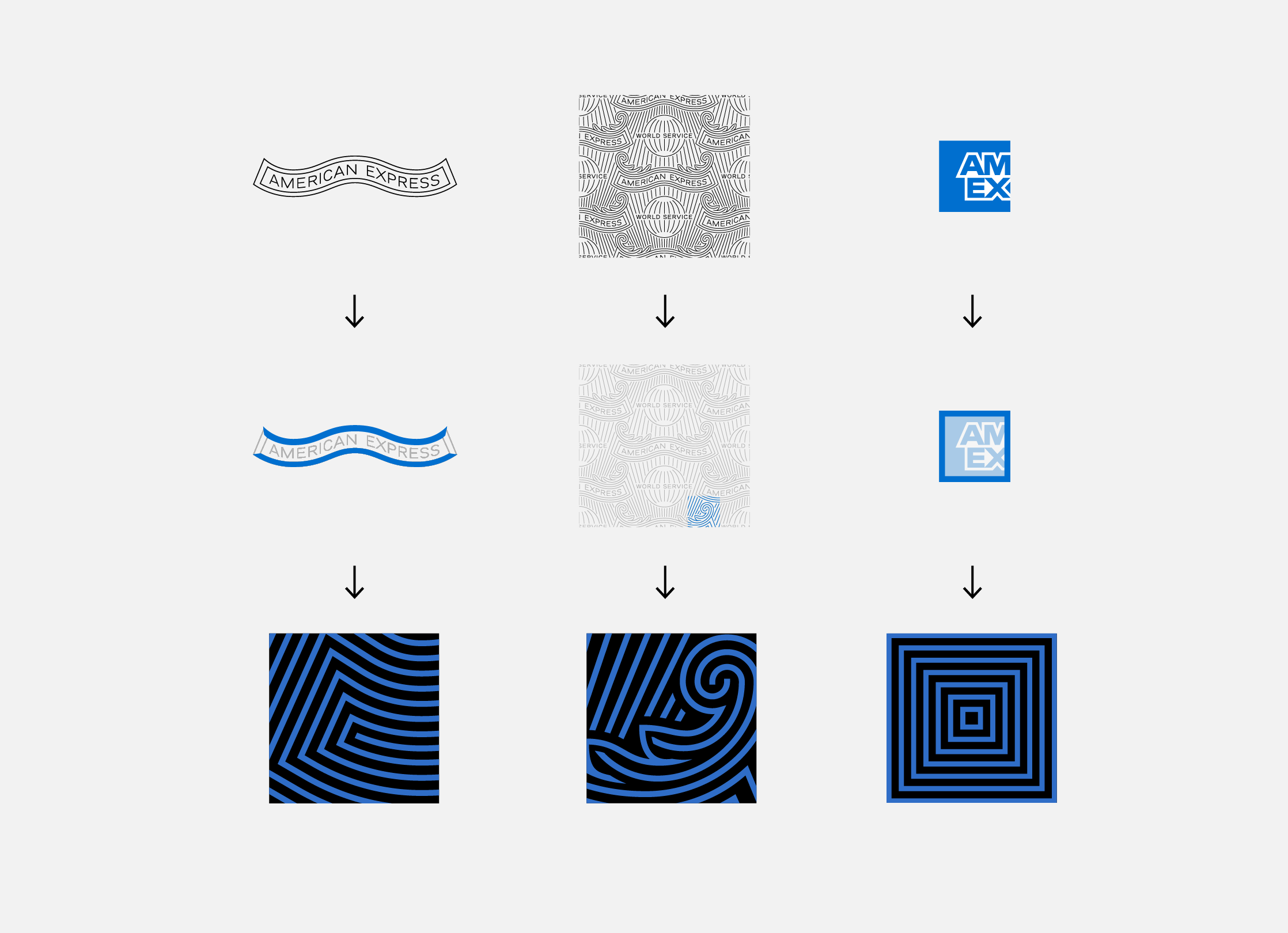 Using the Amex Blue Box as the core visual foundation, the wordmark was crafted by extracting and elevating this iconic element—transforming it into a central visual metaphor and modular building block from which the broader Visual Identity System could unfold. Building on this foundation, our team reinterpreted supporting elements from Amex’s legacy design system, weaving them into a series of graphic patterns that unified and extended the identity across all applications.