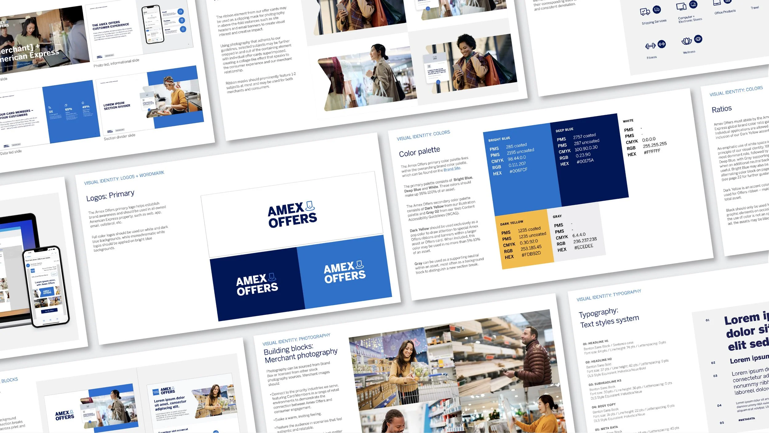 As Associate Creative Director of Design, I co-led the development of a new visual identity strategy and playbook, redefining the system to align with the platform’s growing complexity and reach. This included establishing core design principles through a robust VI system and expanding the visual language across logo, typography, UI, and layout, and creating a flexible, future-facing system applied across web, video, and advertising. The result repositioned Amex Offers as a premium, closed-loop alternative to traditional digital advertising for merchants while reinforcing its role as a key Membership benefit to consumers.