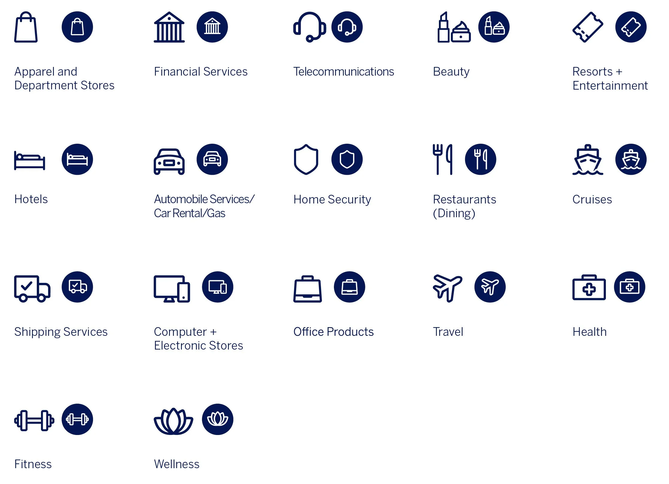 The playbook included a customized modular icon system for the Amex Offers Visual Identity Playbook, grounded in American Express’s enterprise design standards and optimized for scale. Built to represent 15+ distinct merchant industries, the system balances consistency and flexibility through shared geometry, stroke logic, and visual hierarchy—enabling clear communication across marketing, product, and advertising touchpoints while remaining extensible as new partner categories are introduced.